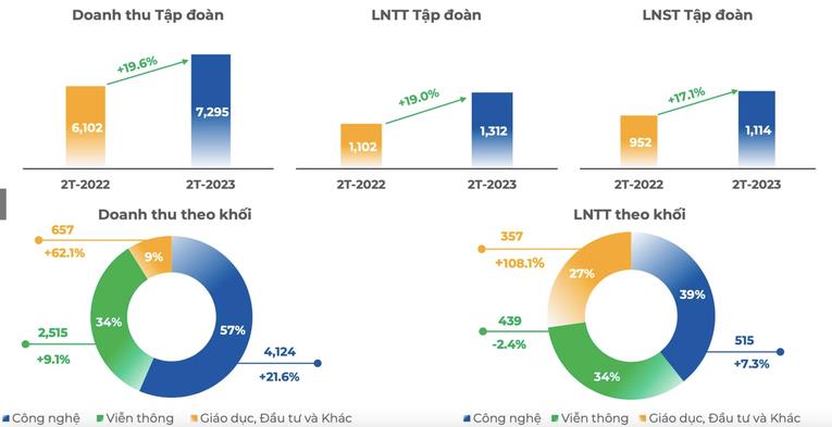 Mảng công nghệ đóng góp 57% vào doanh thu tập đoàn với 4.124 tỷ đồng, tăng 21,6%. Trong khi đó, mảng viễn thông đem về 2.515 tỷ, tăng 9,1% so với cùng kỳ. Khối giáo dục, đầu tư khác ghi nhận tăng trưởng doanh thu hơn 62% lên 657 tỷ.