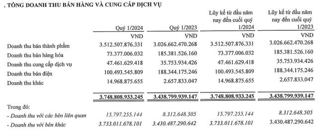 Trong đó, doanh thu bán thành phẩm ghi nhận tại 3.512 tỷ đồng. Ở mảng phát điện, ba tháng đầu năm doanh nghiệp ghi nhận doanh thu 100,4 tỷ đồng, giảm 46% so với cùng kỳ 2023. Nguyên nhân đến từ việc thoái khoản đầu tư dự án điện gió tại Công ty TNHH Gelex Quảng Trị.