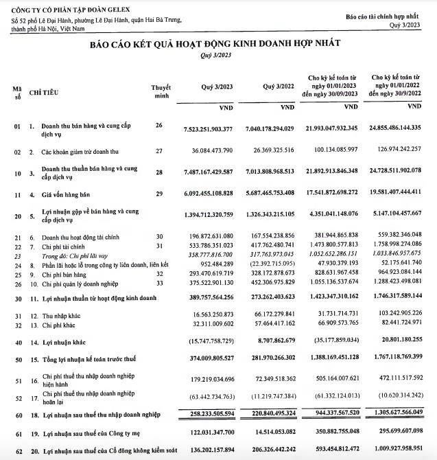 Lũy kế 9 tháng đầu năm 2023, doanh thu thuần hợp nhất của GELEX đạt 21.892,9 tỷ đồng, giảm 11,4% so với cùng kỳ năm ngoái. Lợi nhuận sau thuế đạt 944,3 tỷ đồng, giảm 27,6% so với cùng kỳ.