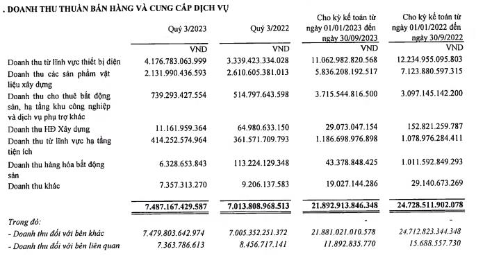 Về cơ cấu doanh thu, doanh thu thuần mảng thiết bị điện chiếm chủ yếu, đạt 4.176,7 tỷ đồng, tăng 25,1% so với cùng kỳ; tiếp đến là doanh thu các sản phẩm vật liệu xây dựng đóng góp 2.131 tỷ đồng, giảm 18,3% so với cùng kỳ.