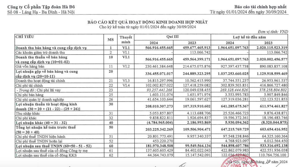 Công ty cổ phần Tập đoàn Hà Đô (mã ck: HDG) vừa công bố báo cáo tài chính hợp nhất quý III/2024 và 9 tháng đầu năm.