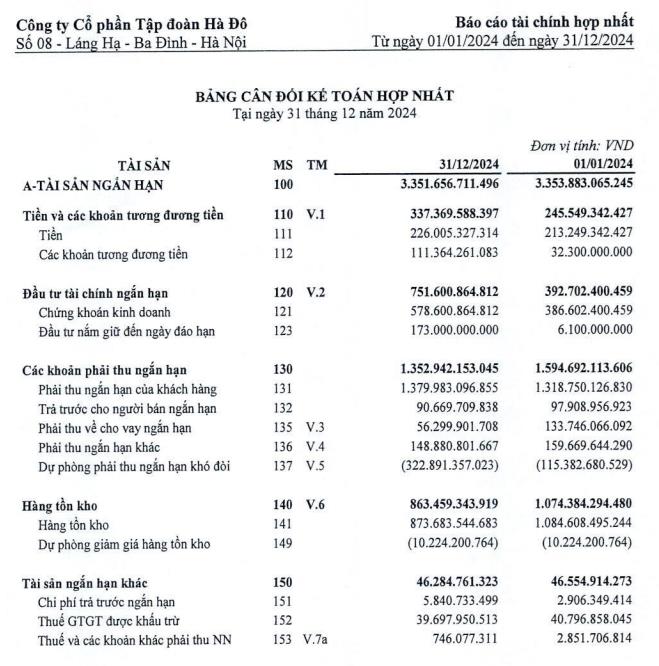 Tính đến ngày 31/12/2024, Tập đoàn Hà Đô ghi nhận tổng cộng tài sản 13.935 tỷ đồng, giảm 503 tỷ đồng so với hồi đầu năm. Trong đó, chiếm chủ yếu là tài sản dài hạn với hơn 10.584 tỷ đồng.