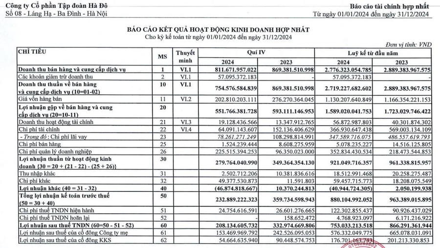 Tập đoàn Hà Đô (mã ck: HDG) vừa công bố báo cáo tài chính hợp nhất quý IV/2024 với doanh thu thuần đạt gần 754,5 tỷ đồng, giảm 13% so với cùng kỳ năm trước.