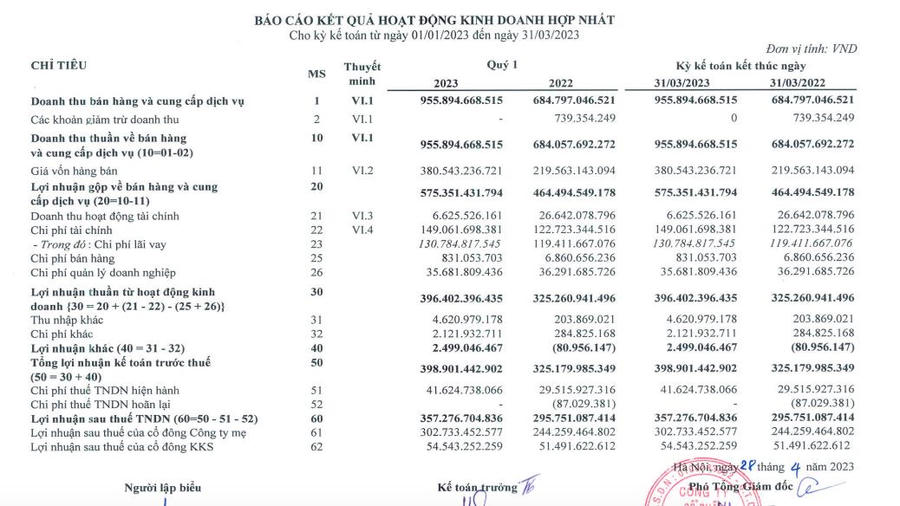 Công ty cổ phần Tập đoàn Hà Đô (mã Ck: HDG) vừa công bố kết quả kinh doanh quý I/2023 với doanh thu thuần đạt gần 956 tỷ đồng, tăng gần 40%.