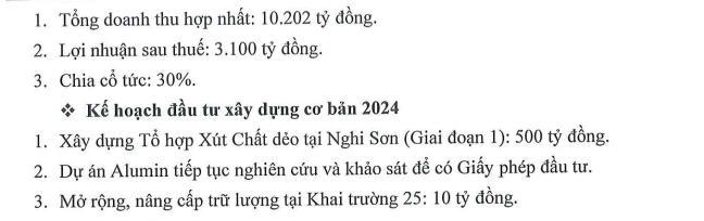 Bên cạnh đó, tập đoàn sẽ tiếp tục nghiên cứu và khảo sát để có giấy phép đầu tư cho dự án Alumin. Ngoài ra, công ty cũng sẽ dành 10 tỷ đồng để mở rộng, nâng cấp trữ lượng tại Khai trường 25.
