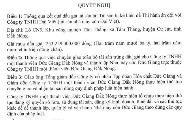 Theo quyết nghị của Hóa chất Đức Giang, giá mua đấu giá là 253,25 tỷ đồng.