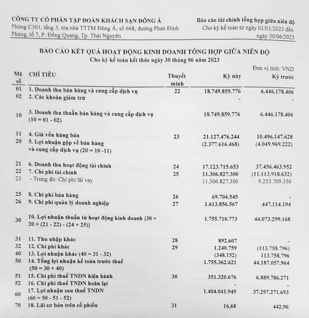 Về kết quả kinh doanh, tính chung nửa đầu năm 2023, Tập đoàn Khách sạn Đông Á ghi nhận doanh thu thuần đạt 18,75 tỷ đồng, tăng 190,7% so với cùng kỳ.