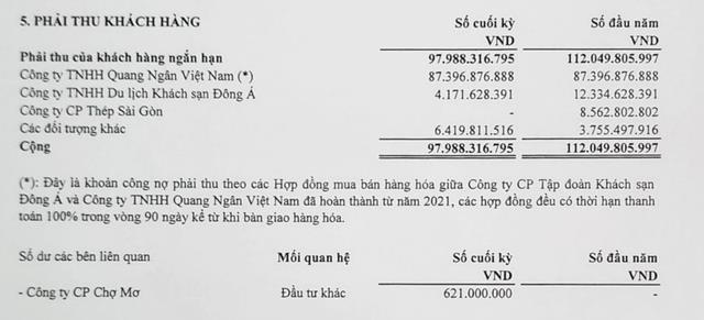 Về khoản công nợ đối với Công ty Quang Ngân Việt Nam số tiền 87,39 tỷ đồng, Tập đoàn Khách sạn Đông Á cho biết, hiện tại, Công ty này vẫn đang hoạt động bình thường, Tập đoàn Khách sạn Đông Á cũng đã nhiều lần thúc giục thanh toán công nợ tồn đọng trên nhưng do một số khó khăn trong công việc kinh doanh nên Công ty Quang Ngân chưa thể thanh toán được công nợ này và đã xin gia hạn thanh toán trong năm 2023. Tập đoàn Khách sạn Đông Á xác định khoản công nợ này vẫn có thể thu hồi đủ nên chưa tiến hành trích lập dự phòng trên Báo cáo tài chính.