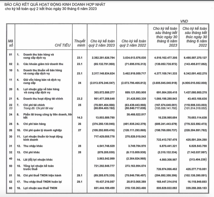 Về kết quả kinh doanh, trong quý II, doanh nghiệp ghi nhận doanh thu thuần giảm 33,1% so với cùng kỳ, đạt 2.317 tỷ đồng. Lợi nhuận gộp giảm từ 889 tỷ đồng xuống hơn 303,5 tỷ đồng.