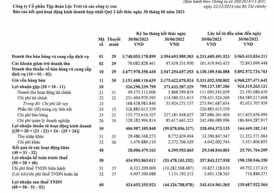 Về kết quả kinh doanh, Lộc Trời ghi nhận doanh thu thuần quý II/2023 đạt 3.678 tỷ đồng, tăng 3,6% so với cùng kỳ. Doanh thu hoạt động tài chính cũng đem lại cho công ty khoản thu gấp 8,5 lần so với cùng kỳ, ghi nhận tại 49,3 tỷ đồng.