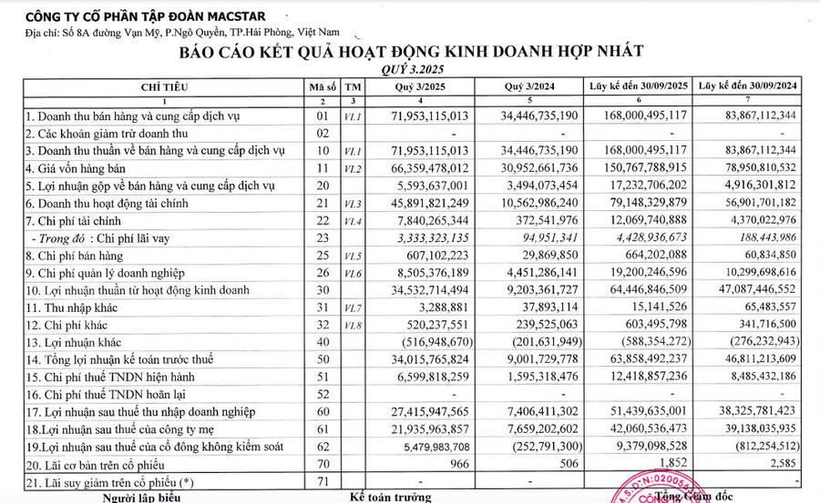 Về kết quả tài chính, theo báo cáo kinh doanh hợp nhất quý III/2025, MAC đạt doanh thu thuần 71,9 tỷ đồng, tăng 108,9 % so với cùng kỳ.