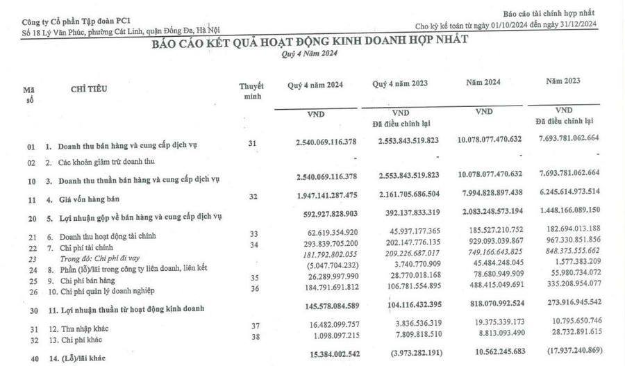 Về bức tranh tài chính, theo báo cáo tài chính kinh doanh hợp nhất quý IV/2024, PC1 đạt 2.540 tỷ đồng doanh thu thuần, giảm nhẹ so với cùng kỳ năm trước. Giá vốn giảm tới 10%, qua đó kéo lãi gộp tăng 51% lên gần 593 tỷ đồng.