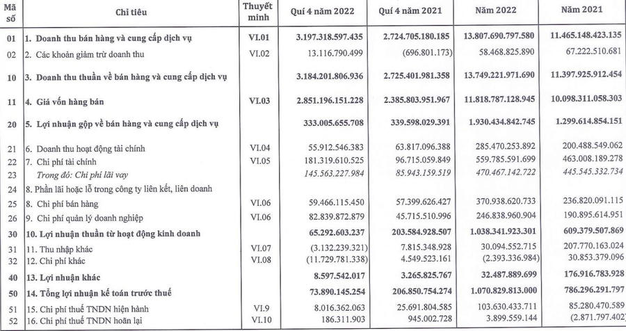 Cụ thể, riêng quý 4 doanh thu thuần đạt 3.184 tỷ đồng, tăng 17% so với cùng kỳ năm ngoái. Giá vốn hàng bán cũng tăng cao nên lãi gộp đạt 333 tỷ đồng giảm nhẹ so với quý 4 năm ngoái, theo đó biên lãi gộp giảm từ 12,5% xuống còn 10,5%.