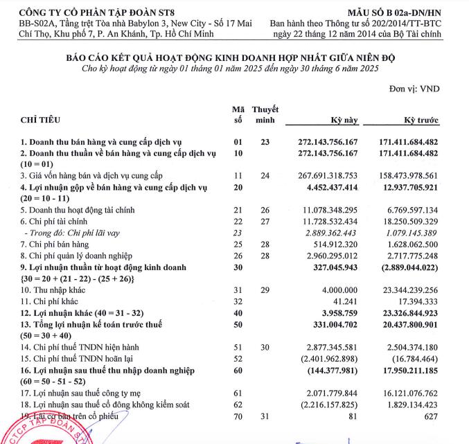 Về bức tranh tài chính, theo báo cáo hợp nhất giữa niên độ, ST8 ghi nhận doanh thu thuần đạt 272,1 tỷ đồng, tăng 59% so với cùng kỳ.