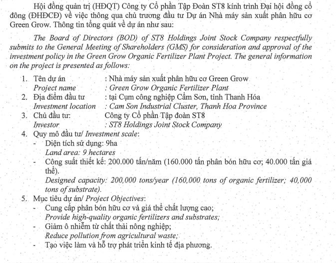 ST8 chủ trương đầu tư dự án Nhà máy sản xuất phân hữu cơ Green Grow, có tổng vốn đầu tư 486 tỷ đồng.