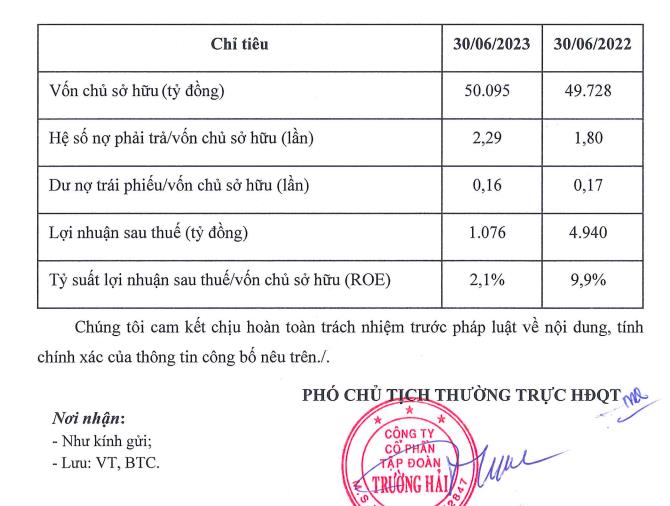 Về kết quả kinh doanh, theo công bố trên Sở Giao dịch Chứng khoán Hà Nội, trong nửa đầu năm 2023, Công ty cổ phần Tập đoàn Trường Hải của tỷ phú Trần Bá Dương ghi nhận lãi sau thuế 1.076 tỷ đồng, giảm hơn 78% so với cùng kỳ năm 2022.