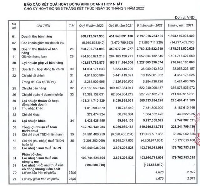 Luỹ kế 9 tháng đầu năm, doanh thu thuần của tập đoàn ghi nhận đạt 2.780 tỷ đồng, tăng 48% so với cùng kỳ. Lãi ròng ghi nhận khoản 404 tỷ đồng, tăng 125% so với 9 tháng năm 2021.