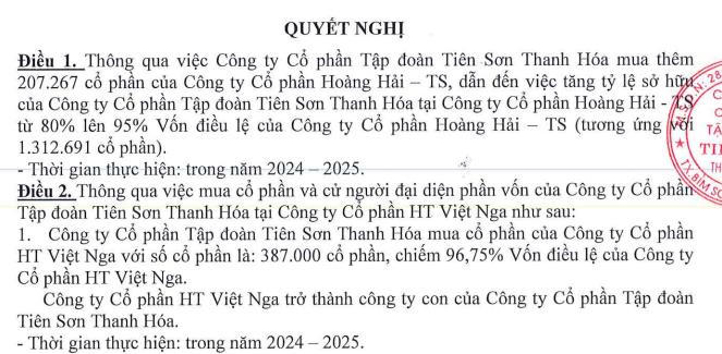 Thời gian thực hiện cả 2 thương vụ trên dự kiến trong năm 2024 - 2025. Nếu thành công, Tập đoàn Tiên Sơn Thanh Hóa sẽ sở hữu 2 công ty con trên trong thời gian tới.
