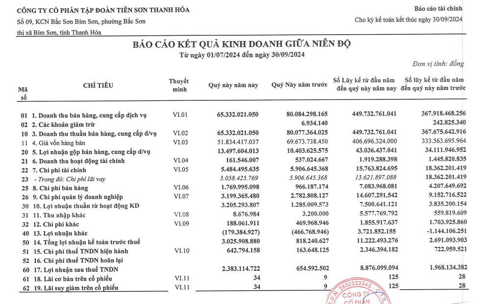 Về kết quả kinh doanh, theo báo cáo tài chính quý III/2024, Tập đoàn Tiên Sơn Thanh Hóa ghi nhận doanh thu thuần đạt 65,3 tỷ đồng, giảm 18% so với cùng kỳ năm ngoái.
