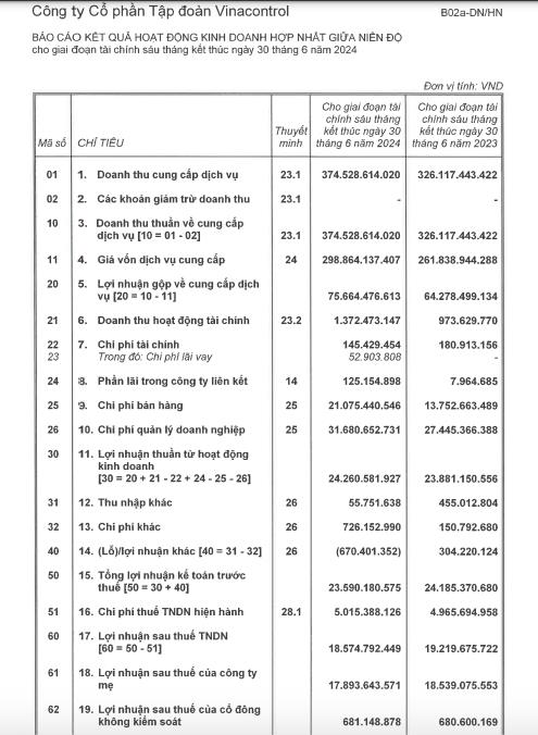 Năm 2024, Công ty đặt mục tiêu tổng doanh thu hợp nhất đạt 735 tỷ đồng và lợi nhuận sau thuế 35 tỷ đồng. Với kết quả trên, Vinacontrol đã hoàn thành hơn một nửa mục tiêu lợi nhuận năm.