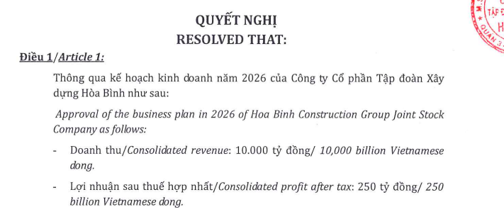 HĐQT Tập đoàn Xây dựng Hòa Bình (mã ck: HBC) vừa công bố quyết nghị về việc thông qua kế hoạch kinh doanh năm 2026 với doanh thu 10.000 tỷ đồng và lợi nhuận sau thuế hợp nhất 250 tỷ đồng.