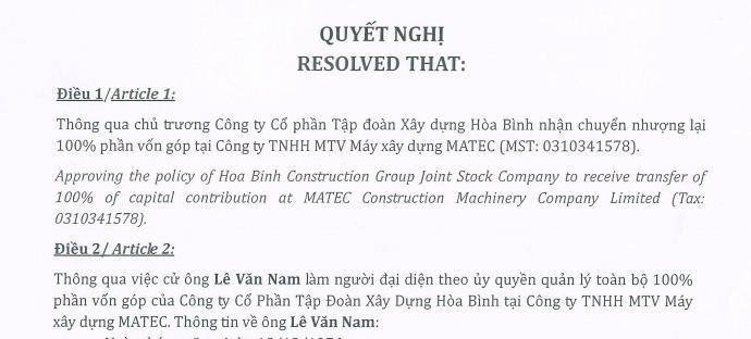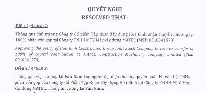 Trước đó, vào ngày 17/6/2023, Hội đồng quản Công ty Xây dựng Hòa Bình đã thông qua nghị quyết bán 100% vốn tại Công ty TNHH Máy xây dựng Matec cho nhà đầu tư có đủ năng lực tài chính.