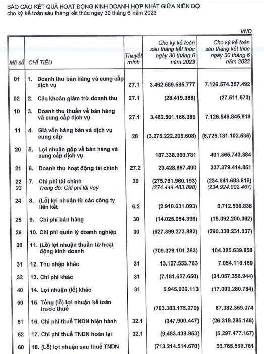 Về tình hình kinh doanh, theo báo cáo tài chính soát xét bán niên 2023, HBC ghi nhận khoản lỗ sau thuế 713,2 tỷ đồng, giảm 815 tỷ so với mức lãi gần 102 tỷ đồng ghi nhận tại báo cáo tự lập.
