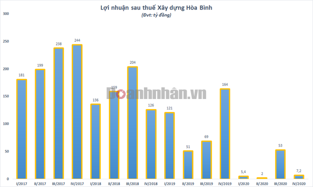 Lũy kế cả năm 2020, Xây dựng Hoà Bình ghi nhận 11.228 tỷ đồng doanh thu thuần và 70 tỷ đồng lãi sau thuế, tương ứng giảm 40% và 83% so với năm 2019. Đây cũng là mức lợi nhuận sau thuế thấp nhất của doanh nghiệp xây dựng này kể từ năm 2015. Với kết quả này, công ty mới thực hiện được 56% mục tiêu lợi nhuận cả năm.