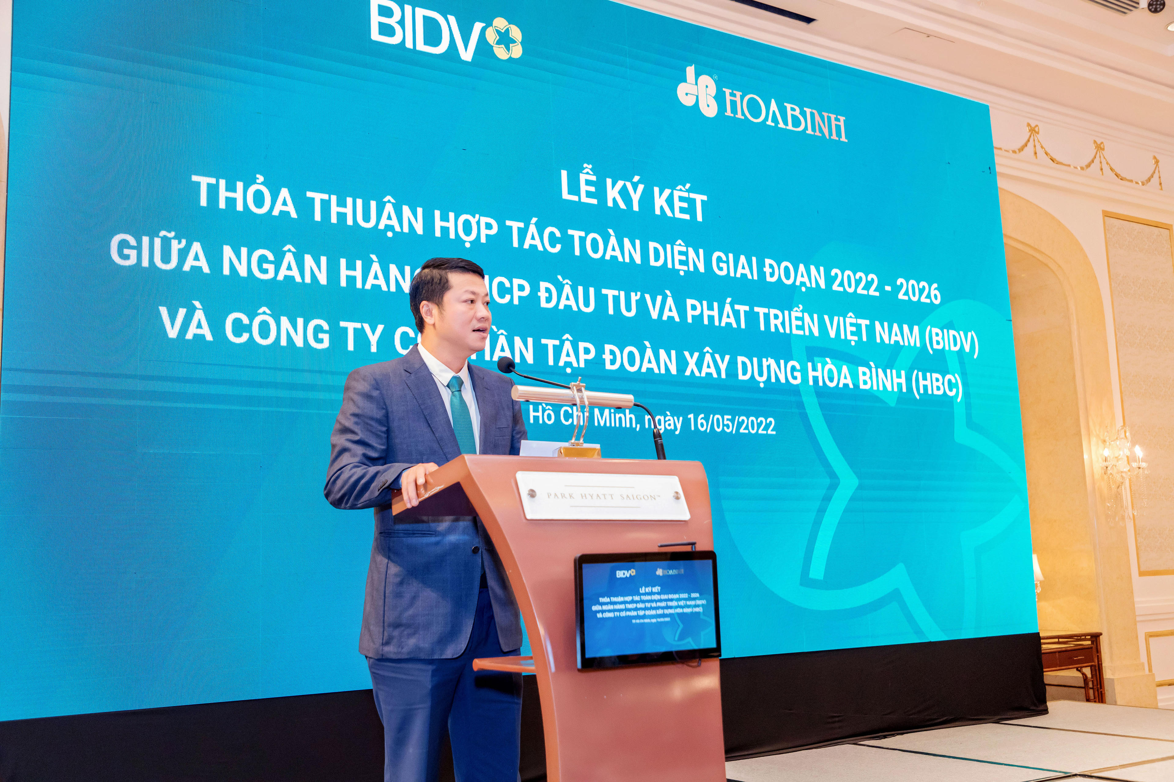 Phát biểu tại buổi lễ, ông Lê Ngọc Lâm - Tổng Giám đốc Ngân hàng TMCP Đầu tư và Phát triển Việt Nam cho biết: “Kể từ khi thiết lập quan hệ tín dụng, BIDV luôn là đối tác tin cậy và đồng hành cùng Tập đoàn Xây dựng Hòa Bình trên từng chặng đường phát triển với dấu ấn là ngân hàng cung cấp hàng nghìn tỷ đồng vốn tín dụng ngắn hạn, cam kết tín dụng cho các công trình thi công lớn, quan trọng của Hòa Bình. BIDV tin tưởng rằng với sự hỗ trợ tích cực trong việc cung ứng các sản phẩm dịch vụ ngân hàng, tài chính hiện đại, ưu việt của BIDV, Hòa Bình sẽ tiếp tục hoạt động kinh doanh có hiệu quả, ngày càng phát triển và lớn mạnh hơn nữa”.