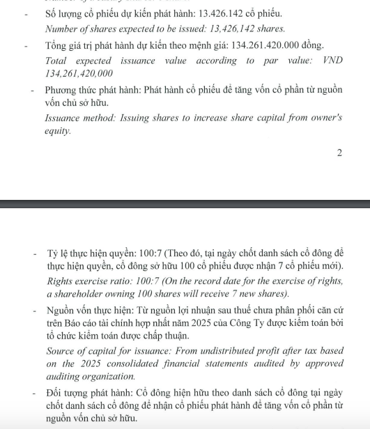 Cổ phiếu chào bán sẽ bị hạn chế chuyển nhượng 01 năm. Thời gian triển khai dự kiến trong năm 2026, sau khi được UBCKNN được chấp thuận bằng văn bản.