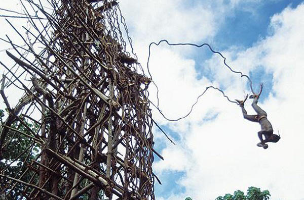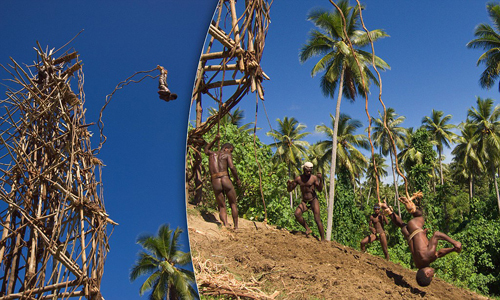 Những cậu bé của quốc đảo Vanuatu muốn trở thành là một người đàn ông, thì chúng phải nhảy "lao đầu xuống đất" từ một tòa tháp cao 30m mà không có bất cứ dụng cụ bảo hộ nào ngoài hai dây leo buộc quanh cổ chân. Nếu cú nhảy thành công, người nhảy sẽ xuống đủ gần để chạm đầu vào đất, lúc đó bộ tộc sẽ công nhận đó là người đàn ông trưởng thành.
