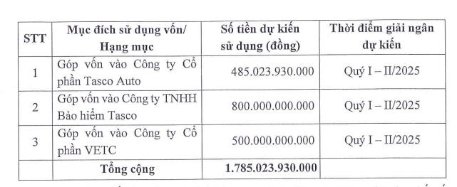 Trong đó, Tasco sẽ góp vốn cho các công ty con, với 485 tỷ đồng được dùng góp vốn vào Công ty cổ phần Tasco Auto; dành 800 tỷ đồng cho Công ty cổ phần Bảo hiểm Tasco; và 500 tỷ đồng còn lại dùng góp vốn vào Công ty cổ phần VETC. Thời gian giải ngân dự kiến trong quý I-II/2025.