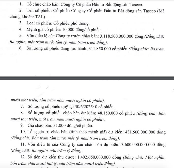 Tại lần lấy ý kiến này, HĐQT Taseco Land trình cổ đông phương án phát hành 48,15 triệu cổ phiếu riêng lẻ, tương đương 15,44% tổng số cổ phiếu đang lưu hành. Mệnh giá phát hành là 31.000 đồng/cổ phiếu, qua đó, TAL dự thu 1.492,6 tỷ đồng qua đợt chào bán lần này. Toàn bộ số tiền thu về từ đợt phát hành sẽ được công ty sử dụng để cơ cấu các khoản nợ vay.