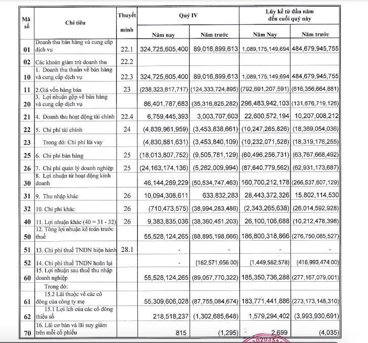 Báo cáo tài chính hợp nhất quý IV/2022 của Công ty cổ phần Ánh Dương Việt Nam (Vinasun - mã: VNS) cho thấy doanh thu thuần đạt 324,7 tỷ đồng, gấp 3,6 lần cùng kỳ năm ngoái.