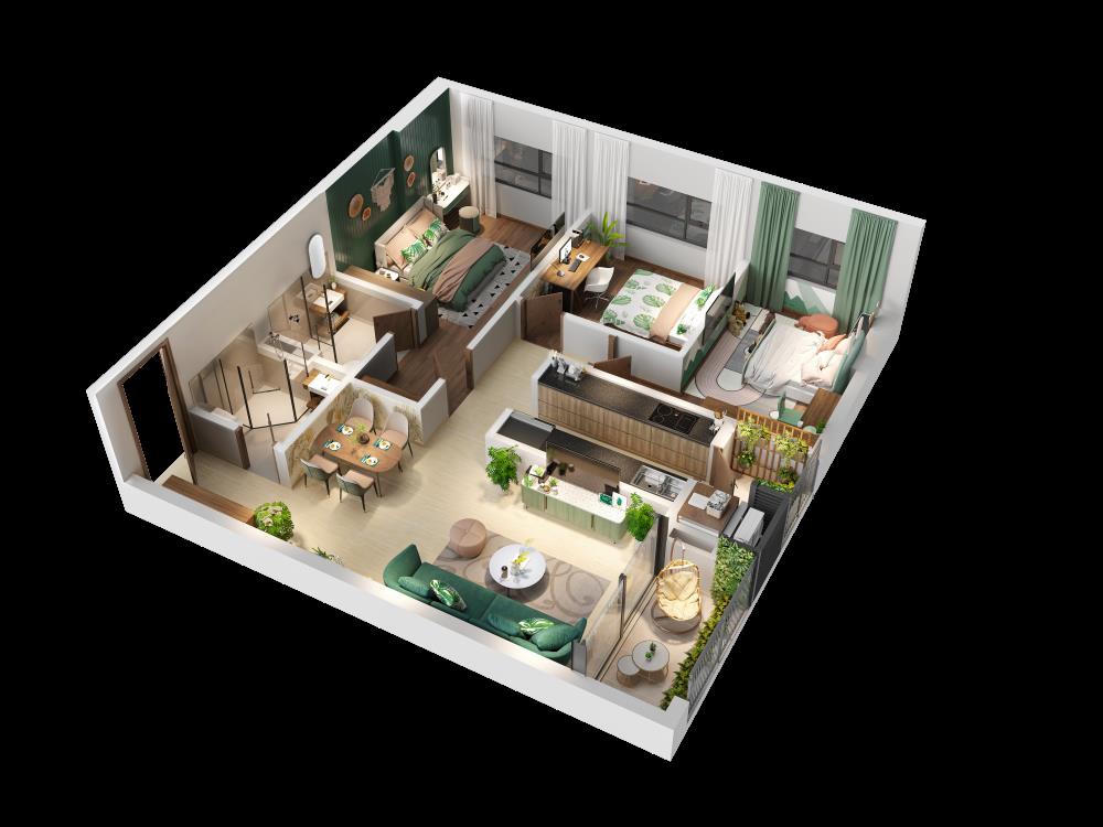 Căn hộ 2 phòng ngủ - một phiên bản "may đo" cho người độc thân và các gia đình trẻ sở hữu diện tích từ 68m2 đến 85m2 với điểm nhấn thiết kế là ánh sáng tự nhiên tràn ngập không gian sử dụng. Ban công rộng rãi không chỉ giúp đón luồng khí mát lành từ thiên nhiên, mà còn là nơi để cả gia đình thư giãn, ngắm hệ sinh thái xanh mát nội khu với đường dạo bộ rợp bóng cây hay làn nước trong veo của tổ hợp hồ bơi rộng gần 1.000 m2.