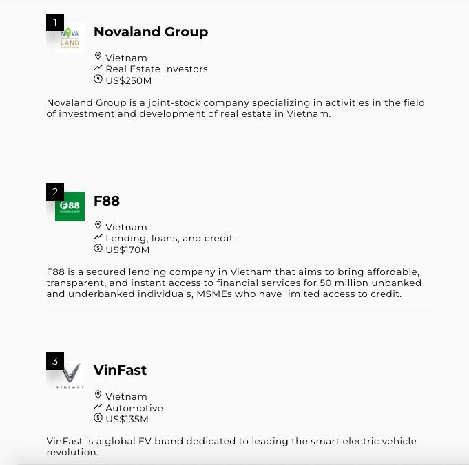 Những công ty startup huy động vốn tốt nhất năm 2023 lọt danh sách top 15 của TechinAsia có thể kể đến như Novaland, Vinfast, Be group, Con cưng…