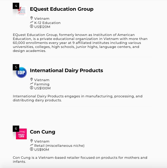 Trong danh sách 15 startup này cũng còn một số tên tuổi khác như doanh nghiệp bán lẻ Concung với tổng số vốn huy động là 90 triệu USD (thứ 6), doanh nghiệp vận tải Be Group với 60 triệu USD huy động được (xếp thứ 8), doanh nghiệp phân phối thuốc tây B2B BuyMed (thuocsi.vn) đạt 51,5 triệu USD (xếp thứ 9)...