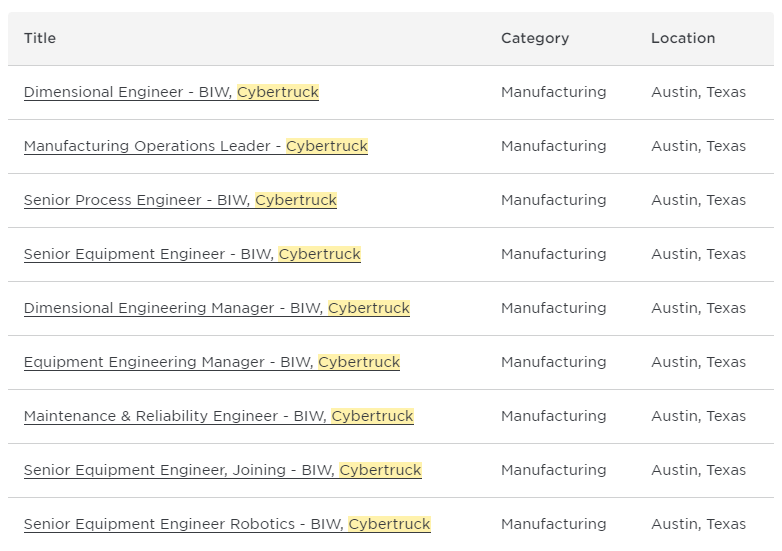Ngoài cập nhật về nhà máy, đợt tuyển dụng lần này của Tesla tại Texas tiếp tục tái khẳng định thông báo trên. Tất cả những đầu việc được tuyển của Tesla trong đợt này đều đi kèm thương hiệu Cybertruck.