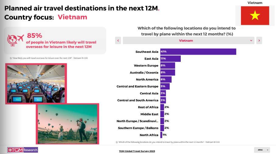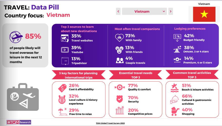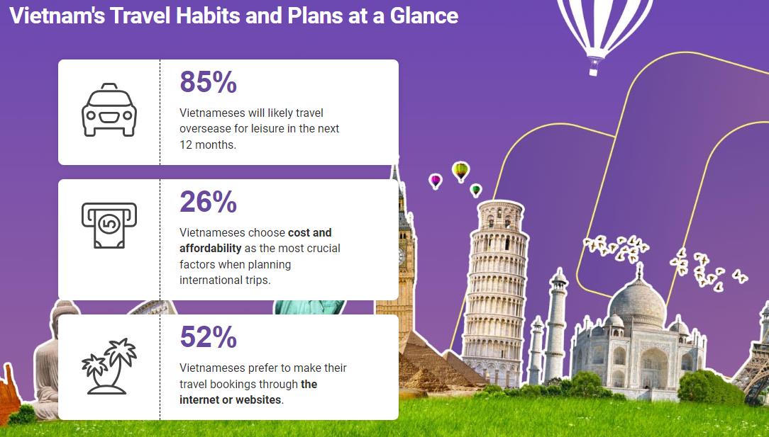 Kết quả cuộc khảo sát cho thấy, 85% đáp viên người Việt bày tỏ ý định sẽ thực hiện một chuyến du lịch nước ngoài trong vòng 12 tháng tới. Trong đó, 26% người tham gia khảo sát ở Việt Nam nhấn mạnh tầm quan trọng của chi phí và khả năng chi trả khi lên kế hoạch cho một chuyến xuất ngoại.