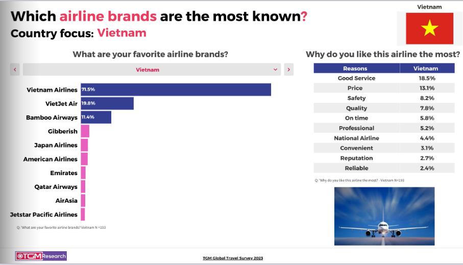 Trong đó, Vietnam Airlines là hãng hàng không dẫn đầu danh sách với 71,5% số người được khảo sát bày tỏ sự yêu thích. Tiếp đến là VietJet Air ở vị trí thứ hai với 19,8%, và Bamboo Airways đứng vị trí thứ ba với 11,4%.
