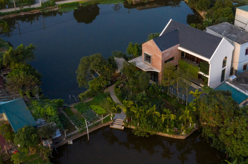 Do gia chủ của ngôi nhà là một cặp ông bà già lớn tuổi yêu nông thôn nên được mô hình “nông nghiệp tự cung tự cấp” gồm vườn rau ăn quả, ao cá, trang trại nuôi gà, trồng lúa kết hợp trên ruộng được sử dụng triệt để.Phương án thiết kế xoay quanh tiêu chí quan trọng nhất là phù hợp với lối sống và thói quen sinh hoạt hàng ngày của gia đình. Các tiêu chí khác như thông gió, ánh sáng tự nhiên cũng được tận dụng. Phần mái ngói có độ dốc lớn nên gia chủ lắp hệ thống thu nước mưa để tái sử dụng trong việc tưới vườn.Trên tinh thần thiết kế mang đến sự gần gũi, thân thuộc, đội ngũ kiến trúc sư đã chọn hình khối và ngôn ngữ của ngôi nhà theo hơi hướng “nhà truyền thống Bắc Bộ” nhưng pha chút hiện đại. Mặt chính nhà quay về hướng Tây. Ngôi nhà có 3 mặt thoáng là tầm nhìn ra vườn, ao rộng và đón gió Nam tốt. Khoảng sân rộng rãi là một nét đặc trưng không thể thiếu đối với những ngôi nhà ở nông thôn, gắn liền với hoạt động gieo trồng, thu hoạch và phơi lúa. Các hoạt động vui chơi của trẻ em hoặc tụ tập ăn mừng, luộc bánh chưng trong ngày Tết cũng diễn ra ở đây. Sân là không gian gắn kết con người với thiên nhiên, gắn kết gia đình với làng xã và cộng đồng địa phương.Tường nhà ở khu vực đón tia nắng mặt trời trực tiếp mạnh nhất được xây dựng hai lớp gạch để chống nóng. Giữa 2 lớp gạch có khe hở rộng 50mm giúp không khí lưu thông làm chậm quá trình truyền nhiệt. Bên ngoài tường được ốp thêm một lớp gạch đặc màu đỏ giúp chống ẩm mốc, chống nóng và tăng độ bền cho tường.Kiến trúc sư áp dụng phép quay khối ở mặt chính giúp ngôi nhà đón gió. Cùng với đó, tầm nhìn ra ao vườn cũng được mở rộng, tạo ấn tượng về sự tương phản của hình khối và vật liệu kiến trúc giữa hai khối nhà.Do mặt tiền của ngôi nhà gần hướng Tây nên phần hiên đóng vai trò là không gian đệm chuyển tiếp giữa trong và ngoài nhà, đồng thời là không gian giảm nhiệt cho phòng khách.“Rèm cây” có chức năng cản nắng và bức xạ, giúp điều hòa nhiệt độ tốt hơn mà vẫn giữ được tầm nhìn thông thoáng. Màu xanh lá giúp không gian thêm hài hòa, đồng thời gia tăng sự gắn kết và gần gũi giữa con người với thiên nhiên.Hệ thống cửa gỗ mô phỏng cửa bức bàn truyền thống với khả năng mở tối đa. Cửa có ray gỗ dọc giúp điều hòa ánh sáng và giảm bớt ánh nắng vào phòng khách. Hệ thống cửa đóng mở dễ dàng giúp kết nối ngôi nhà với hiên và khoảng sân mà vẫn đảm bảo tầm nhìn rộng rãi.Ngôi nhà có bố cục tương tự kiểu nhà 3 gian 2 chái truyền thống ở Bắc Bộ. Trục chính được bố trí từ sân qua hiên vào phòng khách rồi đến khu thờ tự. Trục công năng phụ ở bên cạnh gồm phòng ăn, bếp, phòng ngủ chính, nhà vệ sinh cùng lối đi ra sân vườn thuận tiện mà không ảnh hưởng đến các không gian khác.Để tăng sự kết nối và tương tác giữa các thành viên trong gia đình, khu vực bếp và bồn cây xanh được đặt ở trung tâm của trục chức năng phụ.Khu bếp ngay dưới giếng trời tạo ra sự kết nối theo chiều dọc với 2 phòng ngủ ở tầng trên.Tầng 2 là phòng ngủ của ông bà và các cháu đến chơi mỗi cuối tuần.Không gian mái dốc đươc tận dụng để làm một căn phòng ngủ áp mái nhỏ ngay phía trên phòng ngủ lớn.Tầng 2 bên khu trục chính là phòng chơi bóng bàn của cả gia đình.