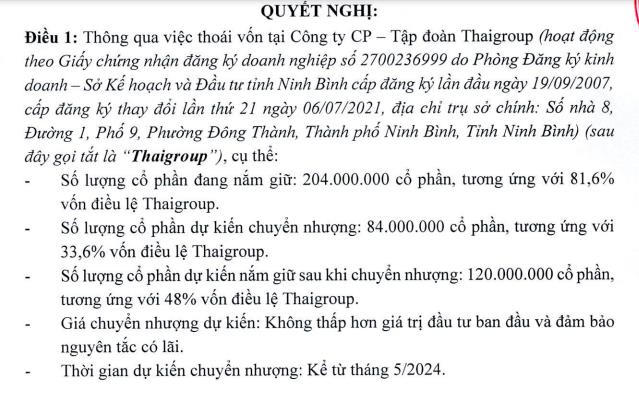 Giá chuyển nhượng 84 triệu cổ phần tại Thaigroup dự kiến không thấp hơn giá trị đầu tư ban đầu và đảm bảo nguyên tắc có lãi. Thời gian dự kiến chuyển nhượng kể từ tháng 5/2024.