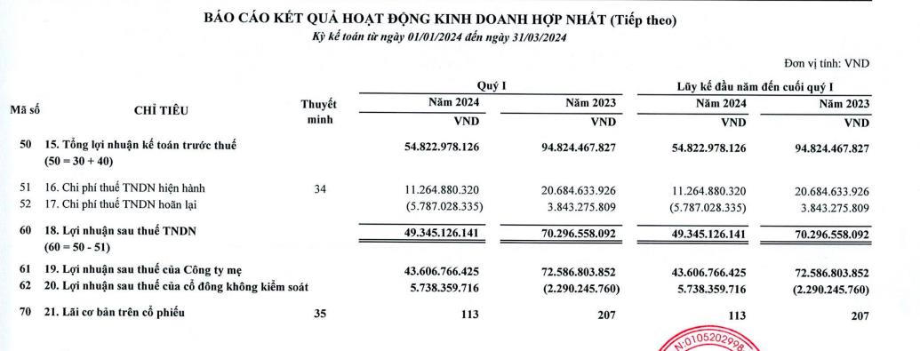 Bên cạnh đó, công ty cũng ghi nhận khoản lãi 30,9 tỷ đồng từ công ty liên doanh, liên kết, trong khi cùng kỳ vào quý I/2023 công ty báo lỗ 18,1 tỷ đồng.