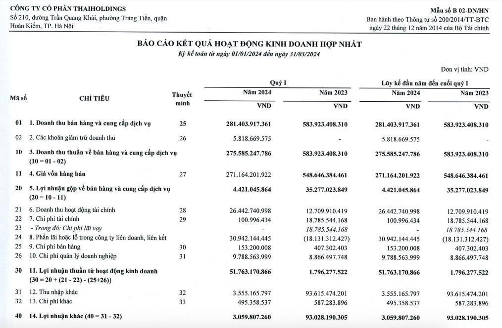 Về tình hình kinh doanh, trong quý I/2024, Thaiholdings ghi nhận doanh thu 275,5 tỷ đồng, giảm 52% so với quý I/2023.
