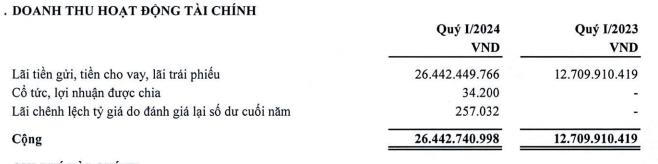 Điểm sáng trong kết quả kinh doanh của Thaiholdings đến từ doanh thu hoạt động tài chính tăng gấp 2,1 lần, lên mức 26,4 tỷ đồng trong quý I/2024. Trong đó phần lớn là lãi tiền gửi, tiền cho vay và lãi trái phiếu chiếm 99,9%.