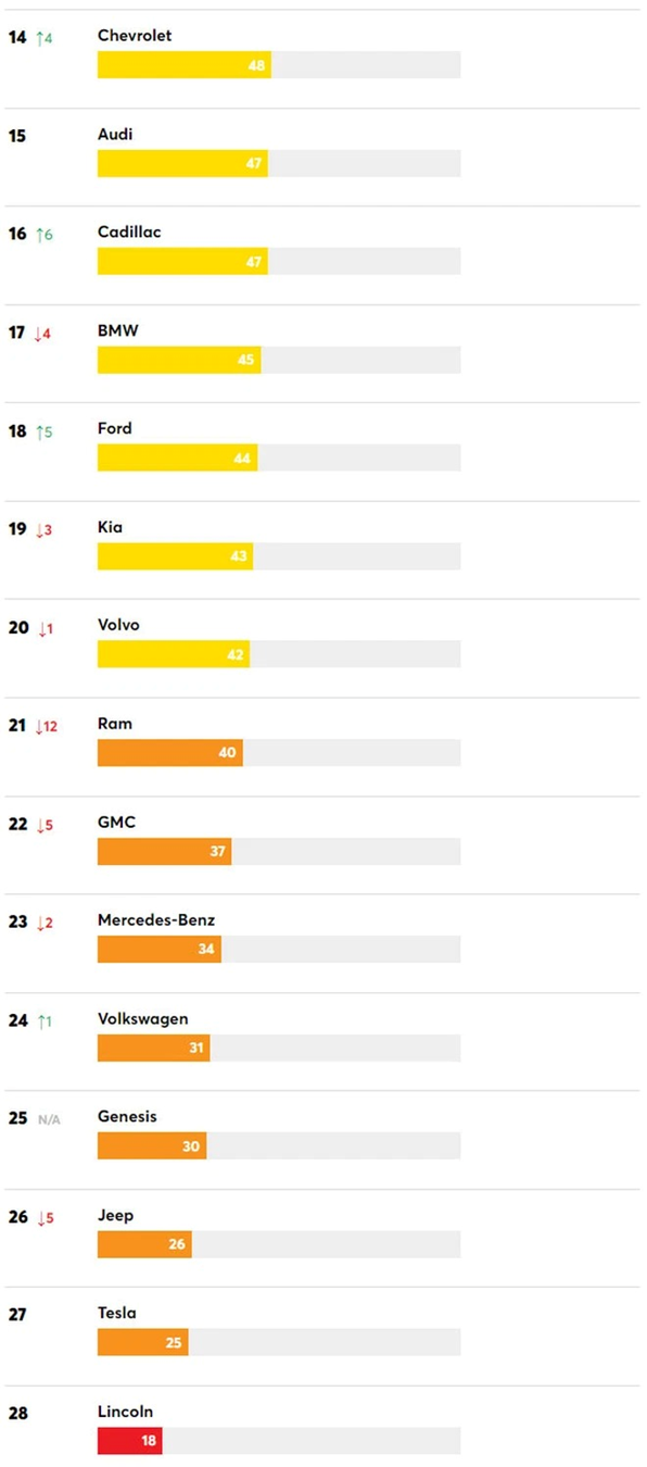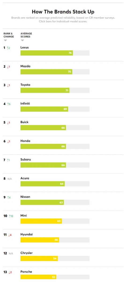 Lexus đứng đầu trong cuộc nghiên cứu năm nay với số điểm 76 điểm, theo sau là Mazda với 75 điểm, Toyota với 71 điểm, Infiniti với 69 điểm. Riêng Buick, Honda và Subaru đều chung mức điểm 66.