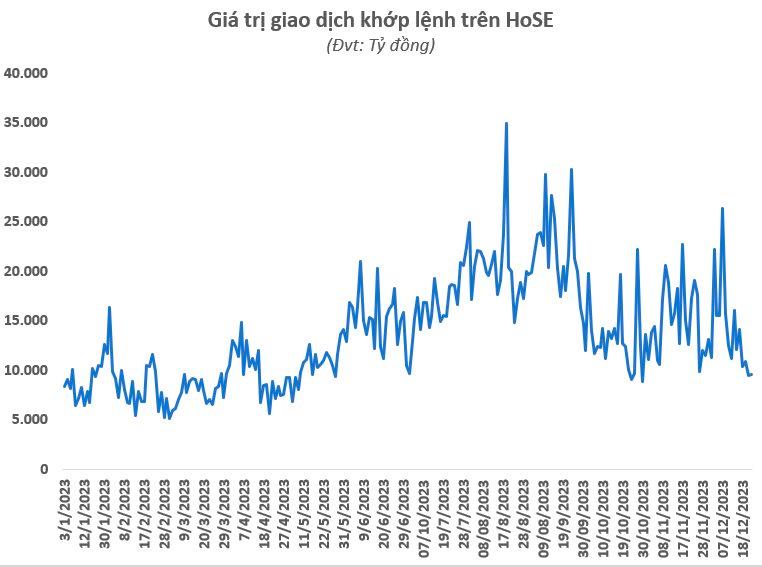 Thị trường chứng khoán vừa trải qua thêm một phiên giao dịch giằng co với thanh khoản tiếp tục phá đáy. Khối lượng khớp lệnh trên HoSE phiên 21/12 chỉ đạt gần 455 triệu cổ phiếu, giảm mạnh so với mức trung bình trước đó. Đây cũng là mức thấp nhất trong vòng 2 tháng qua, kể từ 24/10/2023.