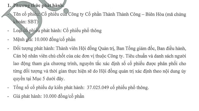 Giá chào bán dự kiến là 12.000 đồng/cổ phiếu, số tiền dự kiến huy động được hơn 1.777 tỷ đồng, SBT sẽ dùng toàn bộ để bổ sung nhu cầu vốn cho hoạt động sản xuất kinh doanh của công ty. Số cổ phiếu phát hành thêm sẽ không bị hạn chế chuyển nhượng, SBT dự kiến thực hiện trước ngày 31/12/2024, ngay sau khi Ủy ban Chứng khoán Nhà nước chấp thuận.