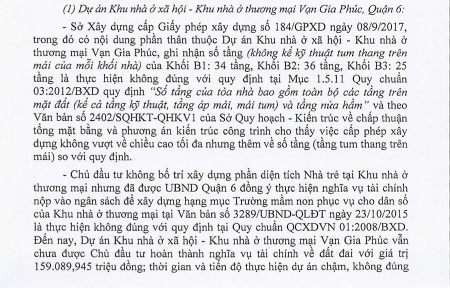 Cụ thể, tại Dự án The Western Capital, Sở Xây dựng TP HCM đã cấp Giấy phép xây dựng số 184/GPXD vào ngày 08/9/2017, trong đó có nội dung xác nhận số tầng của các khối công trình. Theo Giấy phép này, Khối B1 được cấp phép xây dựng với 34 tầng, Khối B2 là 36 tầng, Khối B3 là 25 tầng. Tuy nhiên, Thanh tra Chính phủ cho biết, việc cấp phép xây dựng này đã không tuân thủ đúng quy định tại Mục 1.5.11 Quy chuẩn 03:2012/BXD, trong đó quy định “Số tầng của tòa nhà bao gồm toàn bộ các tầng trên mặt đất, kể cả tầng kỹ thuật, tầng áp mái, mái tum, và tầng nửa hầm”. Thực tế, các khối công trình tại dự án này đã vượt quá số tầng quy định khi thêm tầng tum thang trên mái so với các quy chuẩn đã được quy định.