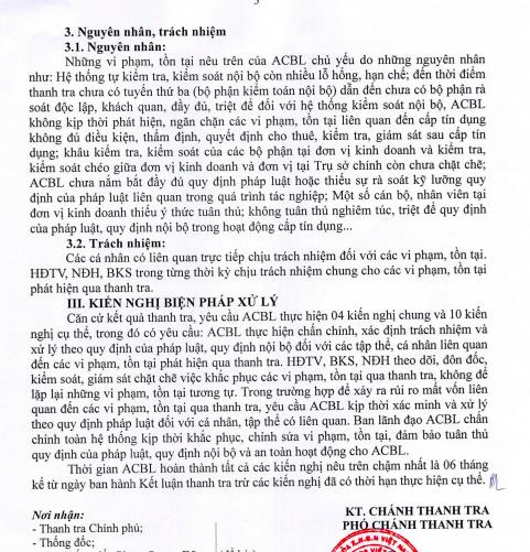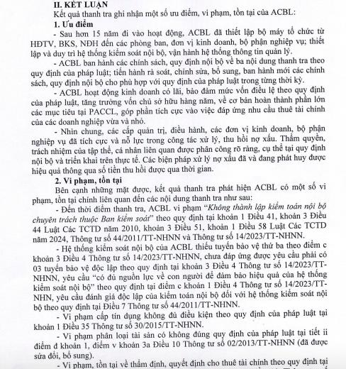 Bên cạnh những mặt được, kết quả thanh tra phát hiện ACBL có một số vi phạm, tồn tại chính liên quan đến các nội dung thanh tra.